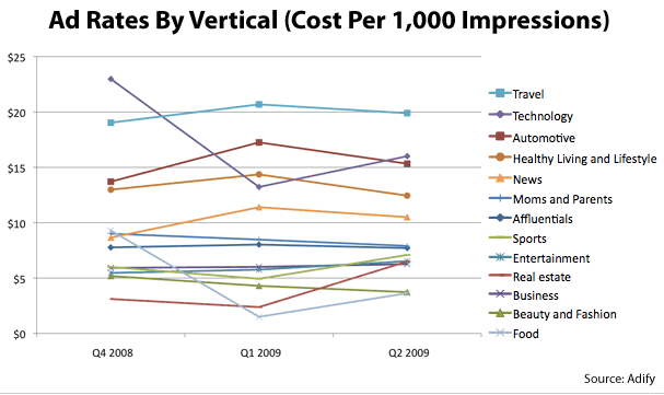 Eine Studie analysierte die durchschnittlichen CPMs, die von verschiedenen vertikalen Kategorien von Werbetreibenden gezahlt werden. Die Reisebranche, in der 8,5 Milliarden bildbasierte Werbeeinblendungen pro Jahr, ist sowohl eine hart umkämpfte Kategorie als auch eine verlässliche Quelle für Werbenetzwerke und große Verlage. Es überrascht nicht, dass die Preise für Reiseanzeigen mit einem durchschnittlichen TKP von $19,89 am höchsten waren.